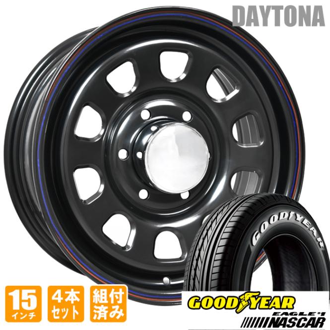 デイトナ 15インチ ブラック クロームリム グッドイヤー ナスカー 195 80R15 ホワイトレター 200系ハイエース 4本セット メッキ タイヤホイールセット