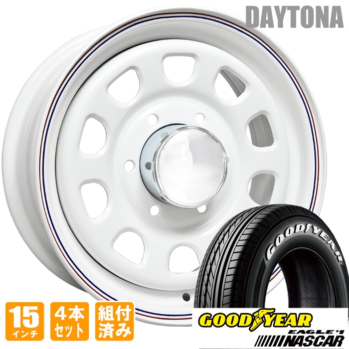 デイトナ 15インチ ホワイト レッド&ブルー ライン グッドイヤー ナスカー 195/80R15 ホワイトレター 200系ハイエース 4本セット タイヤホイールセット