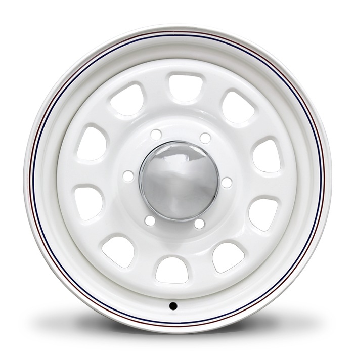 | 商品名 | デイトナ 15インチ | | カラー | ホワイト レッド&ブルー ライン | | サイズ | 15×6.5J+40 6H 139.7 CB110 (200系ハイエース) | | 付属品 | ▼ホイールキャップ ・クローム | |