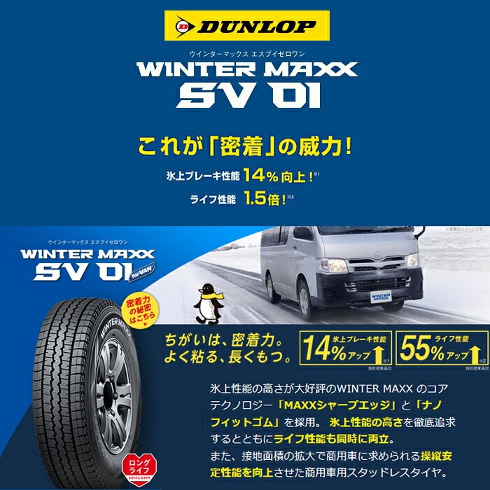 | メーカー | ダンロップ WINTER MAXX SV01 | | サイズ | 195/80R15 107/105L | | 状態 | 新品 | | 備考 | ■商用車専用「新パターン」を開発 ■氷上性能をさらに向上 ■ライフ性能と操縦安定性能を向上 「WINTER MAXX SV01」は、「WINTER MAXX」シリーズで採用した、 凍結した路面に密着することで強力なグリップ力を発揮する「ナノフィットゴム」と、 引っかき効果を高めた「MAXX シャープエッジ」を採用することで氷上ブレーキ性能を当社従来品に比べ14%向上しています。 車検対応のLTタイヤ! ★製造年を指定して発注する事は出来ません。 備考欄に「○○年製希望」とご記入いただいても無効とさせて頂きます。 製造年に関するお問合せには回答することができません。 | |